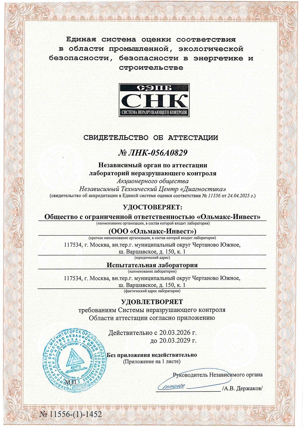 Свидетельство об аттестации № ЛНК-056АО829 от 20 марта 2026 года